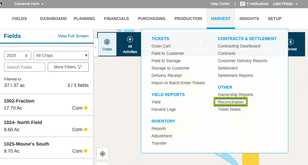 Use the Grain Cart Calibration Report to dial in your Grain Cart scales. This report compares the weight taken from the field to the certified scale weights from the elevator. The report may be found by hovering over 'Harvest' and clicking 'Reconciliation' under 'Other'.