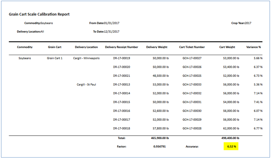 In this example report, the grain cart scale is the calibrated % of the certified scales. You can make adjustments to your scale based on this variance.