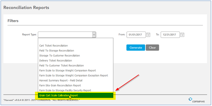 Use the drop-down for 'Report Type' under filters and choose 'Grain Cart Scale Calibration Report'.