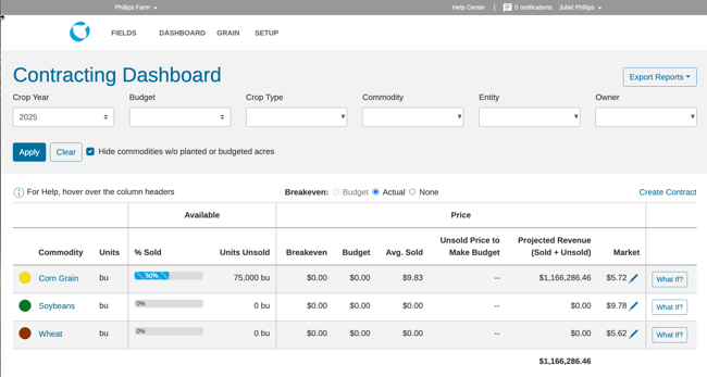 Contracting Dashboard lets you see at a glance your total grain for each commodity, the % sold, and your projected revenue. Market price will be blank until you fill in the current market price for each commodity.