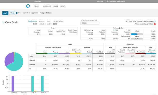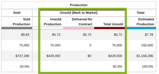 - Total Production (including uncontracted grain) - The next section outlines the full production amount, showing what is sold, what is uncontracted and available to sell (including deliveries), and giving a total estimated production, including the average price per unit, total bushels, total revenue, and the percent of production accounted for.
