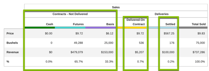 - Contracted Sales - The first section is for total contracted sales, divided by contracted grain not yet delivered, and then deliveries are divided by delivered grain not yet paid for, and settled grain.