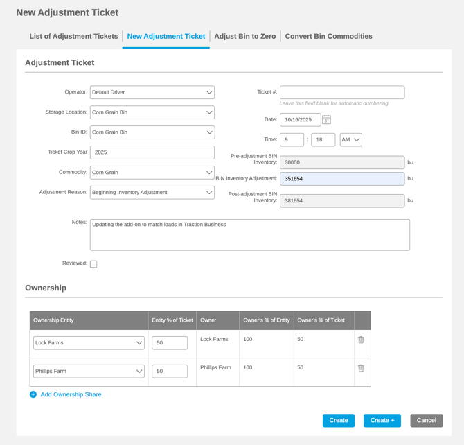 - Click Create+ to add more adjustments for any additional commodity storage locations.