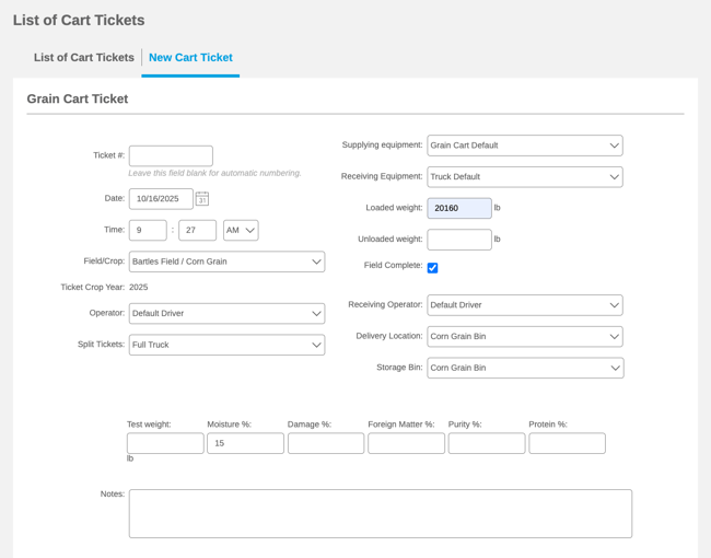Crop Year, Ticket number, date, and time will auto populate unless you choose to manually change them.