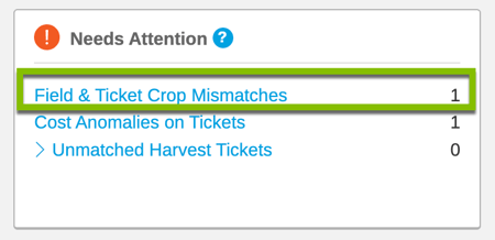 - Find the Needs Attention Pane. The Needs Attention Pane is looking for common errors and Field & Ticket Crop Mismatches is one of them! If you have a mismatch to fix, the number of possible errors will display in the pane.