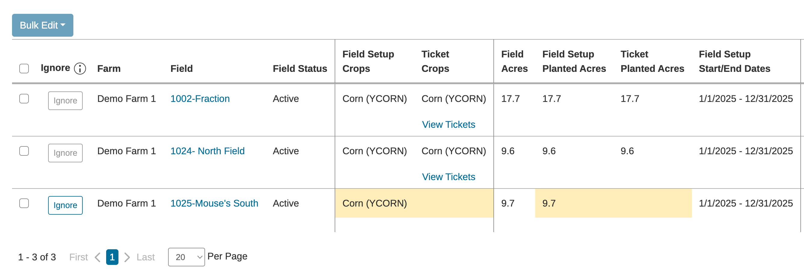 - Click on Field & Ticket Crop Mismatches to open the Crop & Acre Update Tool