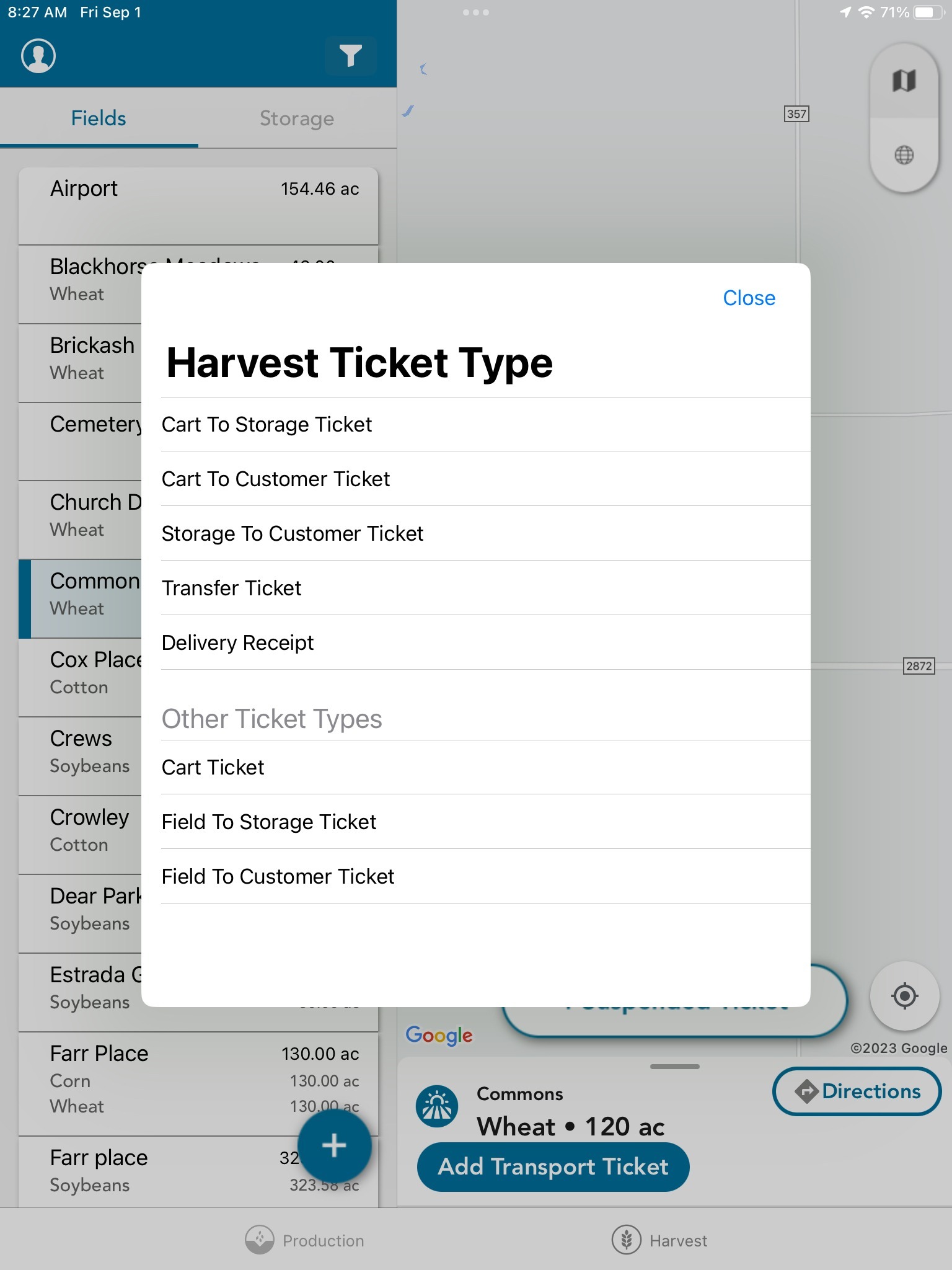 The big thing to keep in mind is the team in the field will need to know what kind of ticket to make. Ticket types are based on where they are getting the grain from, and where they are taking it to. The options you see will be based on your back office settings for harvest.