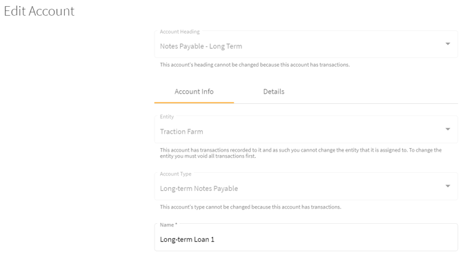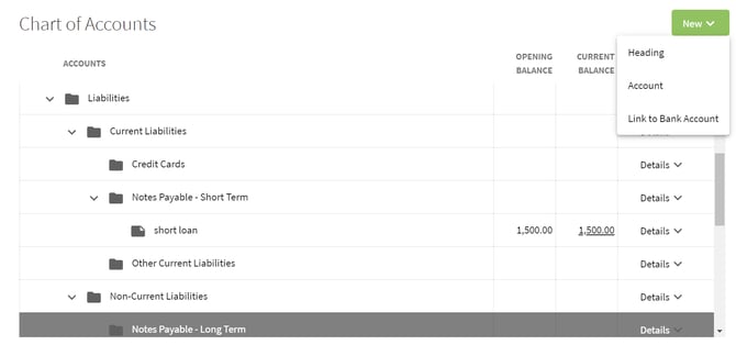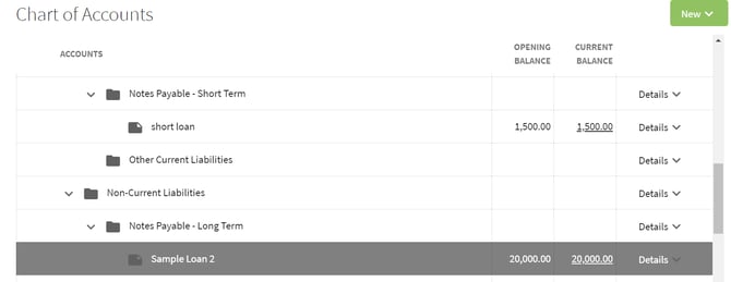 5. The loan has been added to the Chart of Accounts and can be edited by clicking on the Details tab.