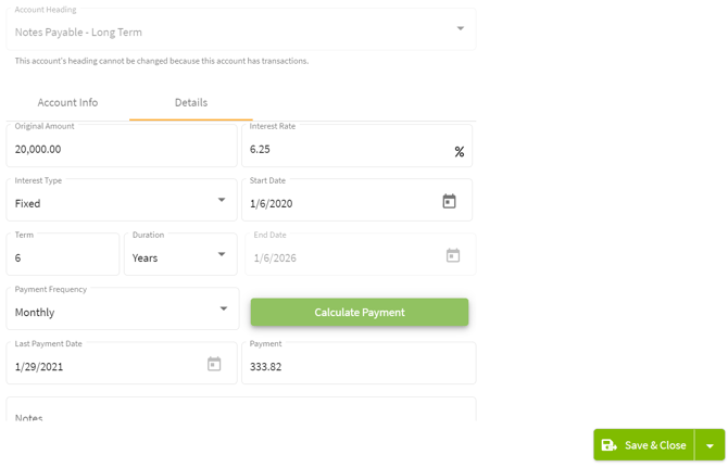 4. Click on the Details tab to the right of Account Info and fill-in all of the information in the boxes. Click on the Calculate Payment button to calculate your payment amount. If this amount is incorrect you are able to edit it. When you are finished filling out the loan details click on the Save & Close button in the right lower corner of this window.