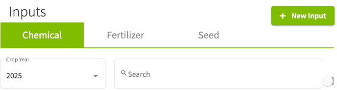 2. Select the Chemical tab. Note: Search for the input first before creating a New Input. If it is not in the list, then click on the +New Input button in the top right to add a new input to the list. |