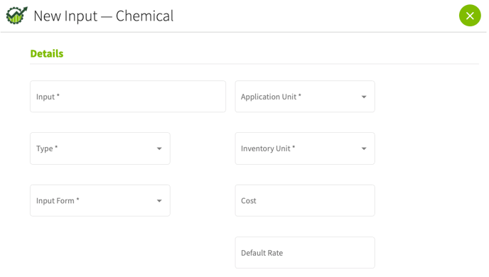 3. Fill in the details for the new input in the New Input - Chemical screen. Click on the Save & Close button at the bottom right to add the chemical to your list. If you need to have volume and weight based units for the input, you will also need to enter in the conversion factor. |