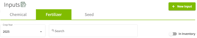 2. Select the Fertilizer tab. Note: Search for the input first before creating a New Input. If it is not in the list, then click on the +New Input button to add a new input to the list. |