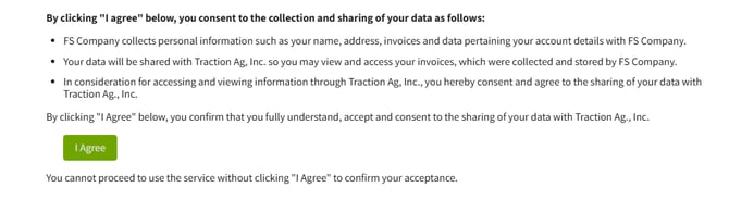 Review your selections and click the Save button. A dialog box will appear prompting you to select I Agree to consent to your chosen FS company or companies sharing billing information to Traction Ag for this integration. Please note that if you do not select I Agree, you will not be able to proceed with using the FS billing integration.