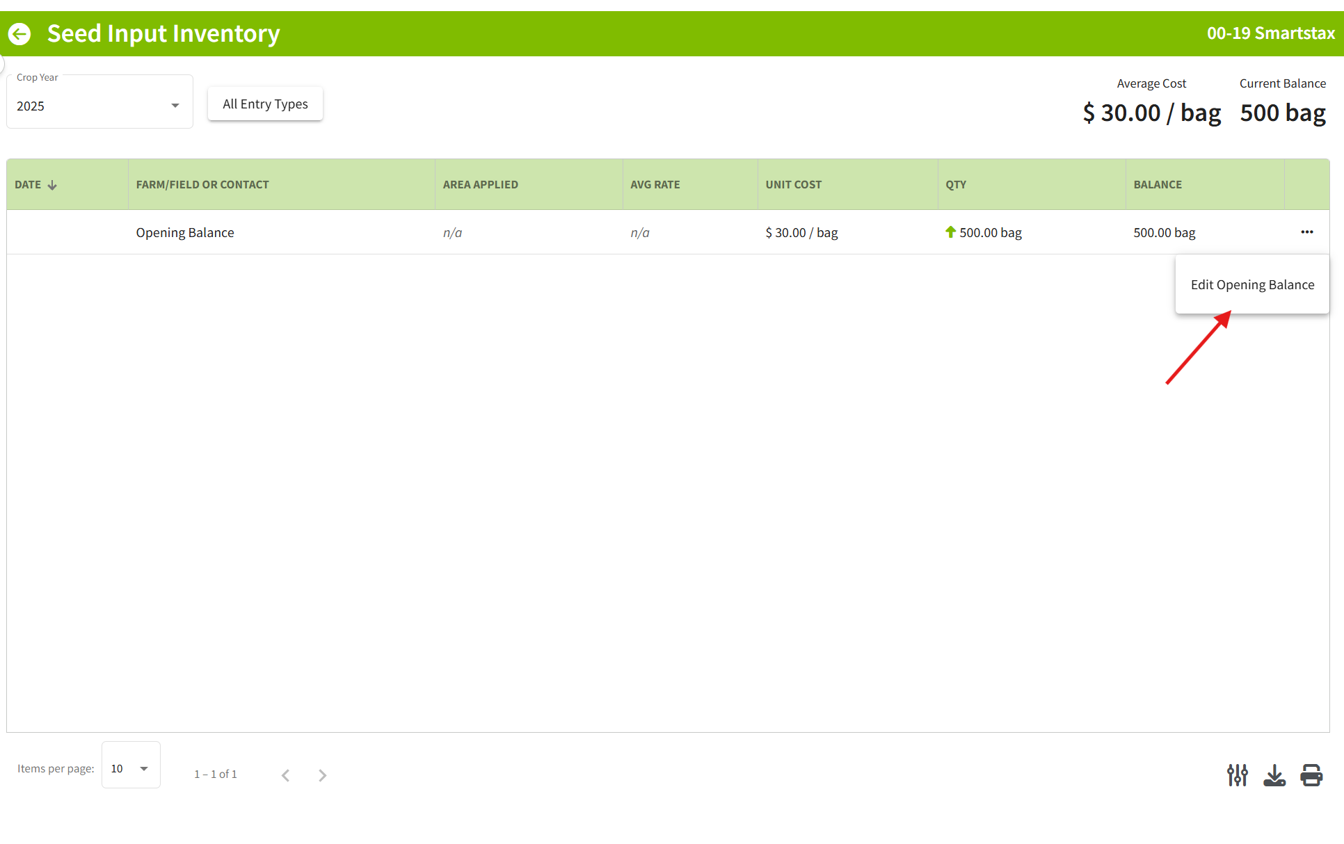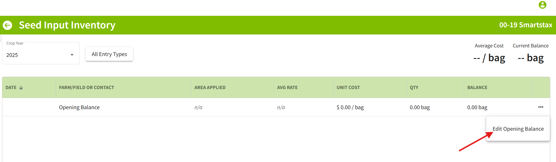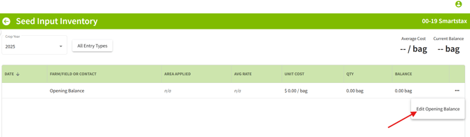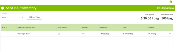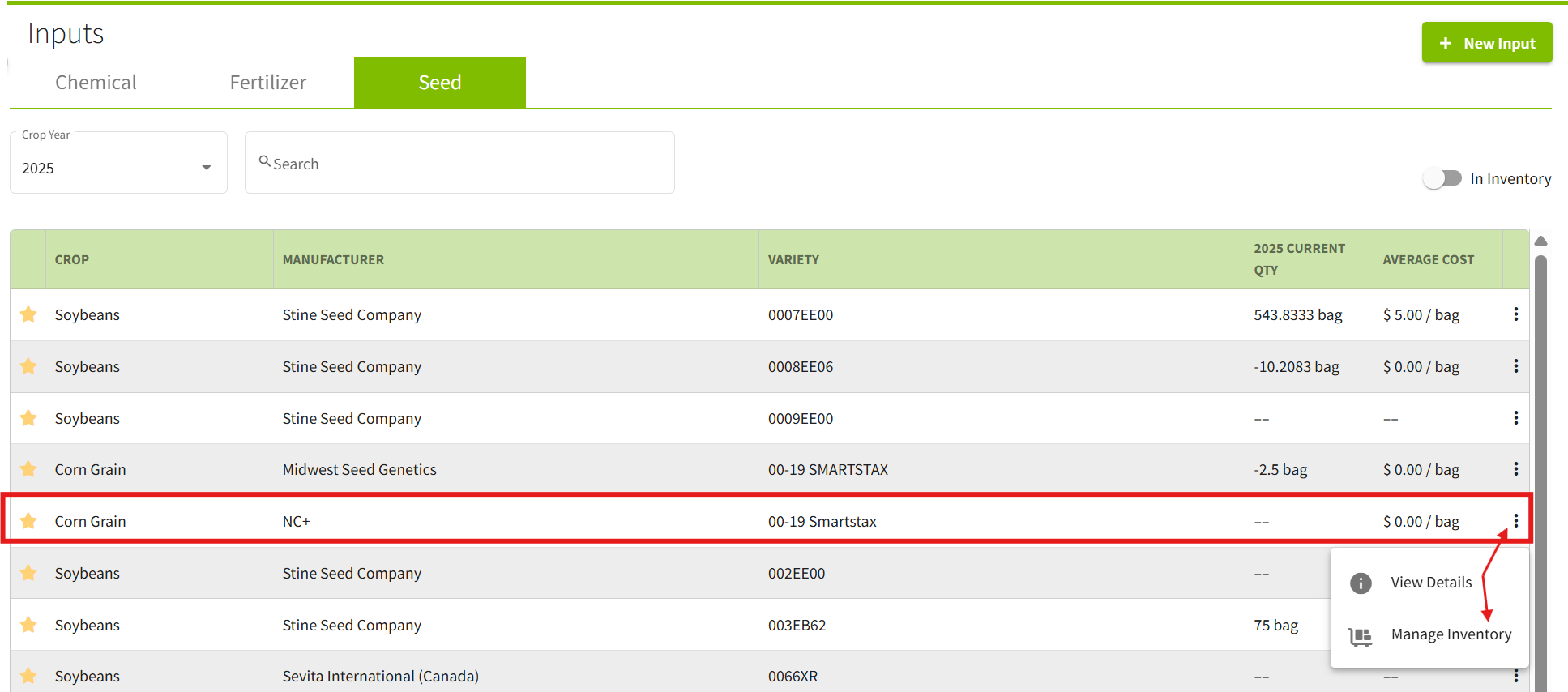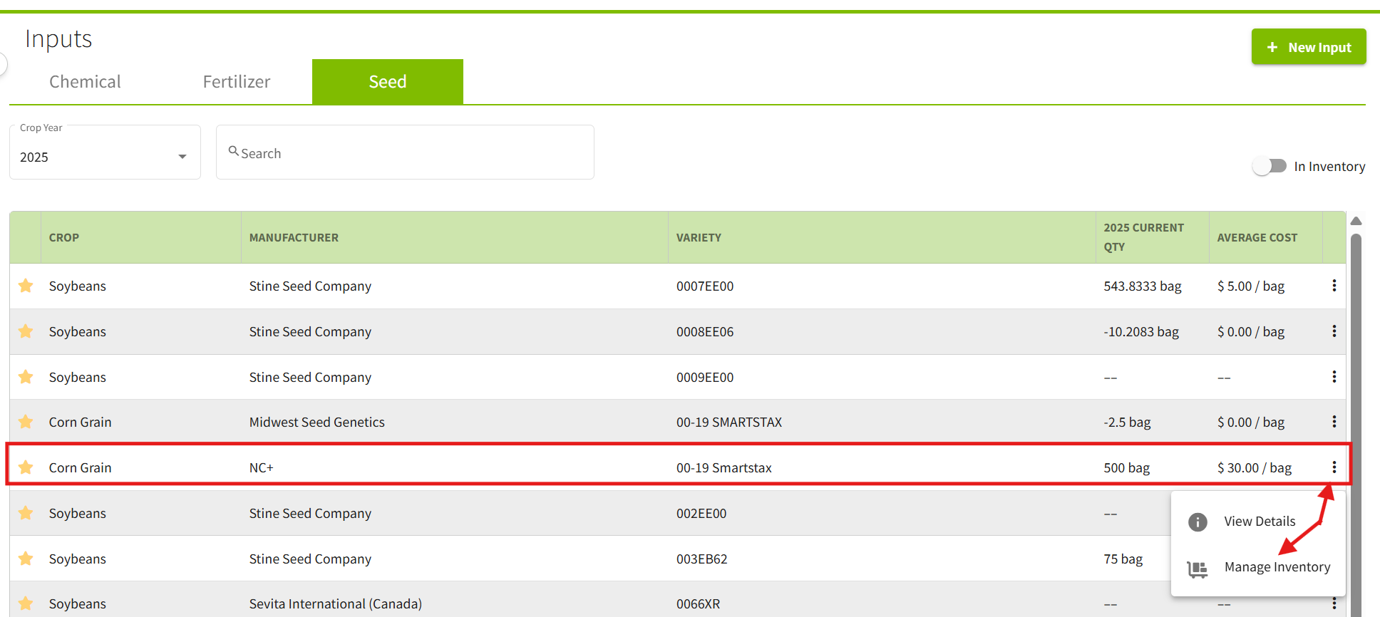 3. Once you have favorited the desired input you will be able to enter in the opening balance. For demonstration purposes, you will see an opening balance entered in for a Seed Input. Click the three dots on the right hand side on the input and click on Manage Inventory.
