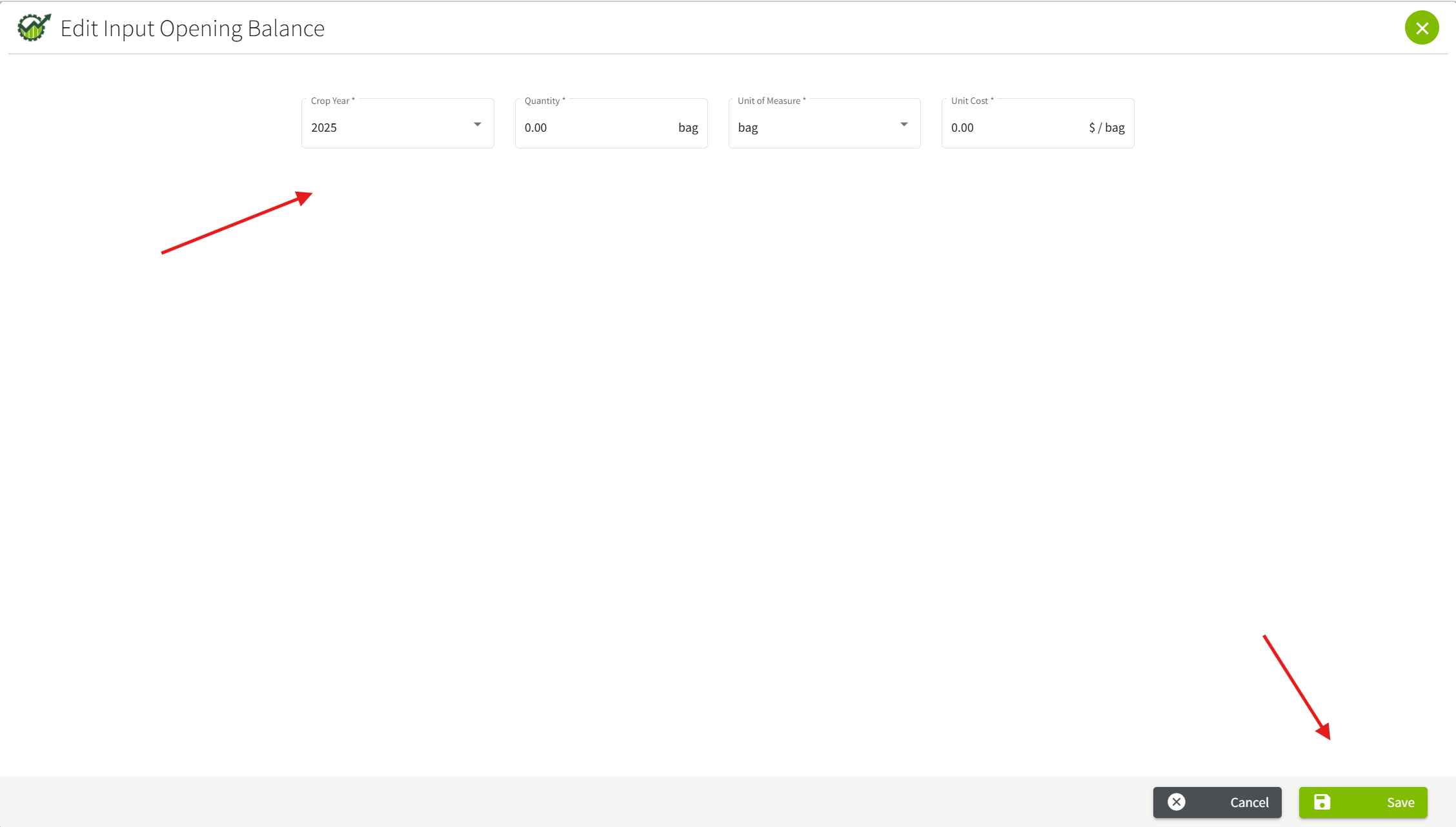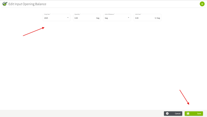 5. Proceed to fill in required details. You will need to select a Crop Year, enter the Quantity, select a unit of measure, and enter in a Unit Cost. Once this information has been filled in, click Save located at the bottom right hand side.