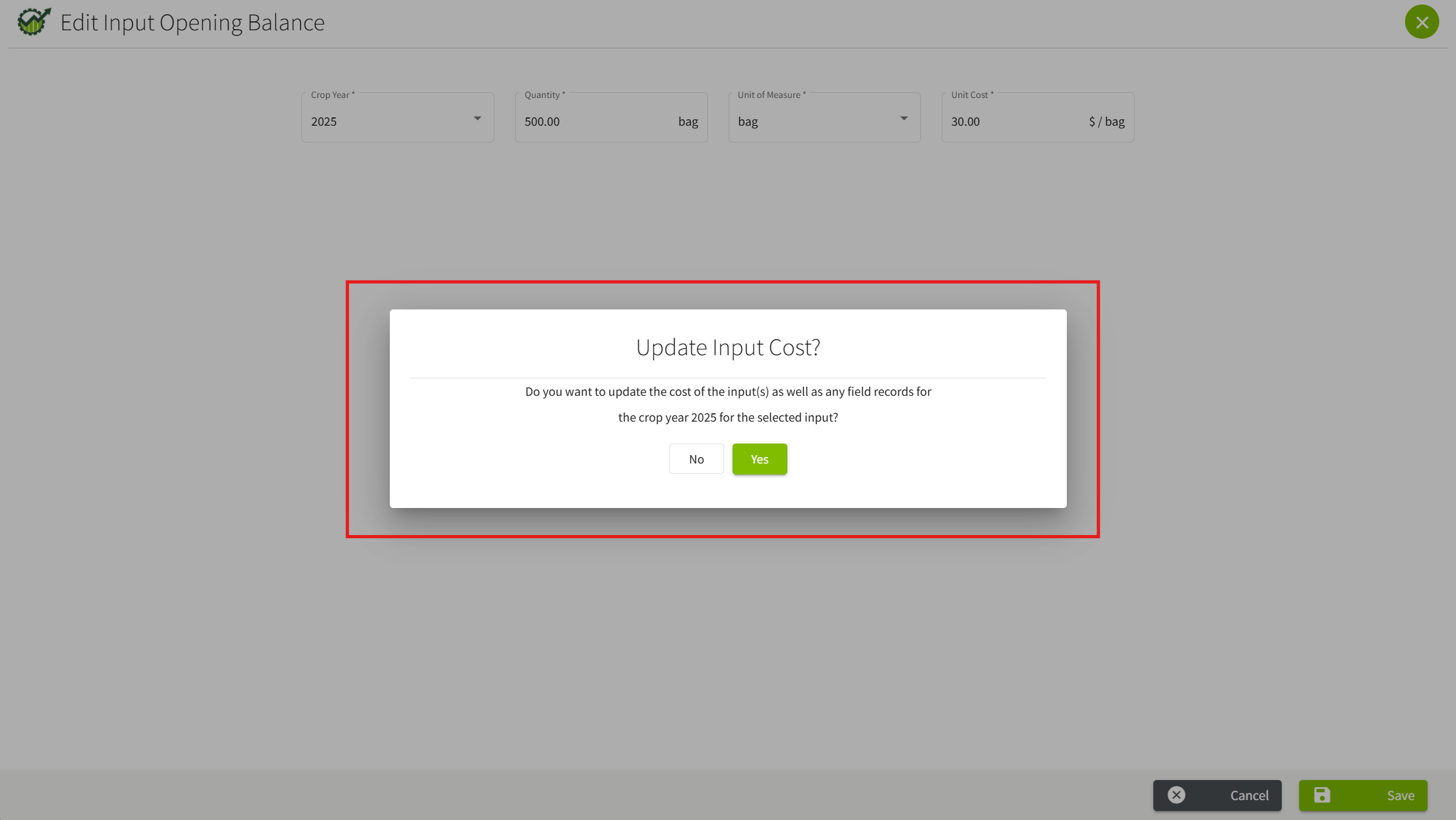 6. You will be asked if you would like to Update the Input Cost for the input for the selected Crop Year.