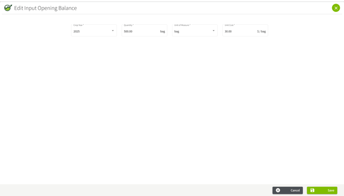 This feature is only available when creating a new input. You will not be able to add or edit an opening balance for inputs that have been previously utilized.