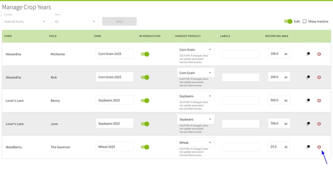 2.Once you are within the Manage Crop Years Page, toggle on the Edit button found at the top right side of the screen.