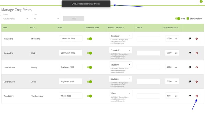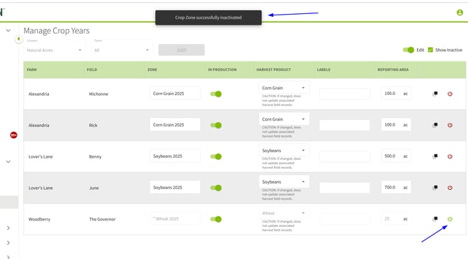 4. Once that action is complete the system will flash a message at the top indicating that you have successfully inactivated the crop zone and the Power icon will now be green