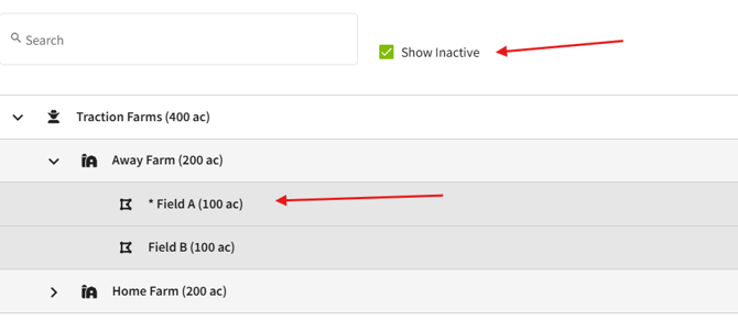 If you wish to view which Fields have been marked as Inactive, Navigate to Farms/Fields and check the box next to Show Inactive. The Field(s) that have been previously inactivated will display with an * symbol as shown below.