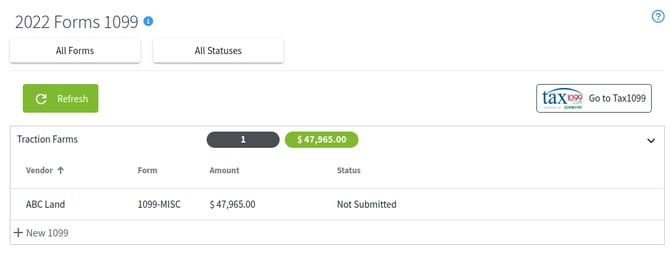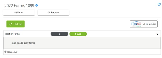 5. Now we will create a 1099. Each of your Entities will be listed in this screen. Simply expand the Entity's list that you want to add a 1099 for and click the + New 1099 button.