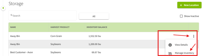 2. Locate the Storage location that you used in Conservis that you designated your harvest load to. For demonstration purposes, I will be showing you Corn Grain that has been synced into Traction Business from Conservis. Locate the desired storage bin and click the three dots to the right.