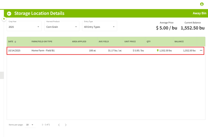 3. Now you will see the Corn Grain located in the storage bin with all of the associated details.