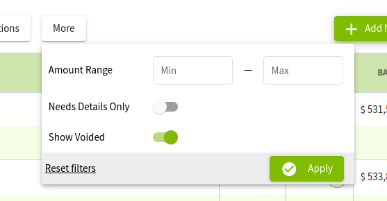 You can view previously voided transactions by clicking on the More button and turning on the toggle for Show Voided. Click Apply to set the filter. Click on the More button and select Reset filters then hit Apply to hide the voided transactions again.