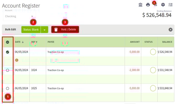 If you need to bulk void / delete transactions, you now do so by clicking the Bulk Edit icon in the Account Register