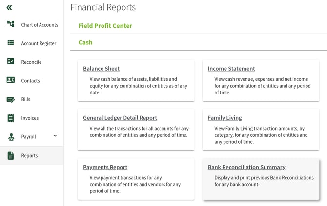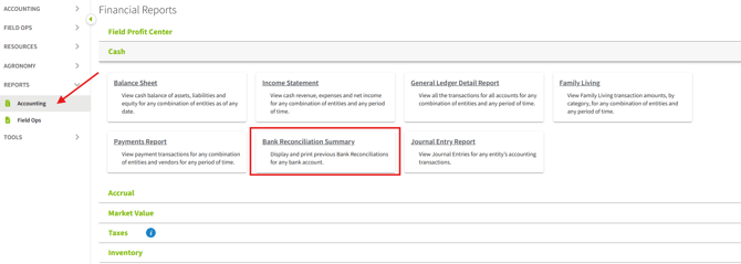 1. Navigate to Bank Reconciliation Summary found in the Accounting portion of Reports.