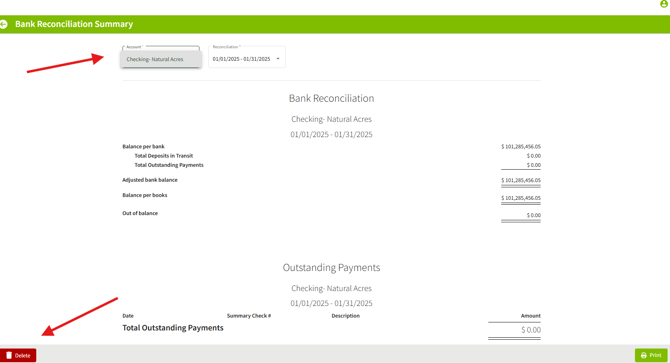 2. Select the desired Account and Date Range located at the top of the Summary Report, then click Delete located at the bottom left hand side. This action will delete the reconciliation.