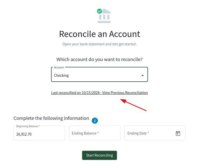 Tip: Before reconciling, you will want to make sure that your Beginning Balance matches what was in your previous accounting system (or checkbook) as of the end of the previous year.