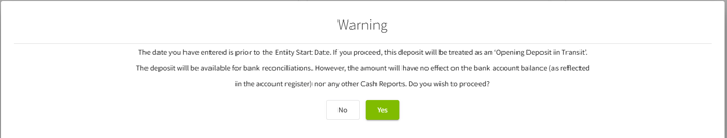 When you add or edit a Payment, Deposit, or Transfer and enter a date earlier than the entity start date, Traction will display a confirmation message when you save the transaction.