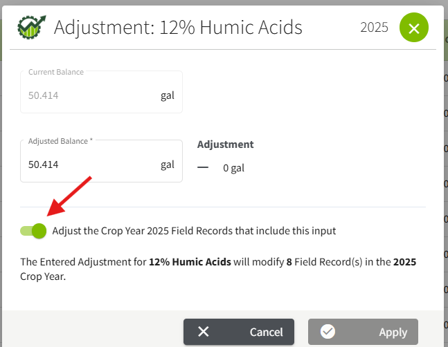 You can then choose how the adjustment should be applied. If the toggle remains on (green), the system will adjust the Field Records associated with the selected Crop Year.