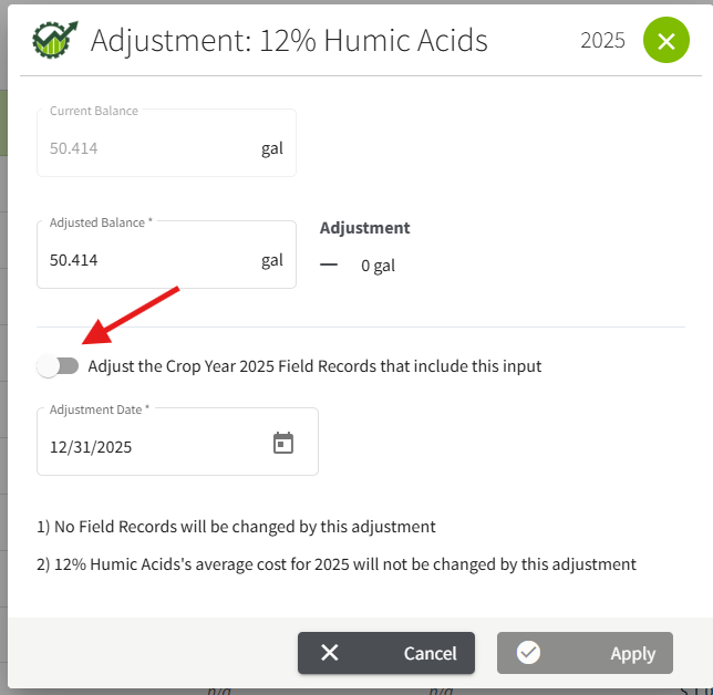 If you do not want to modify Field Records, toggle the switch off. This will update the inventory balance only, without impacting Field Records or the average cost. You will also be required to enter an adjustment date.