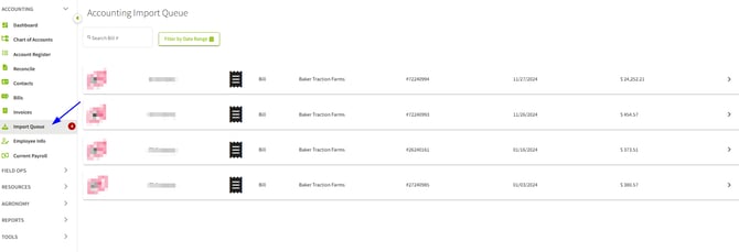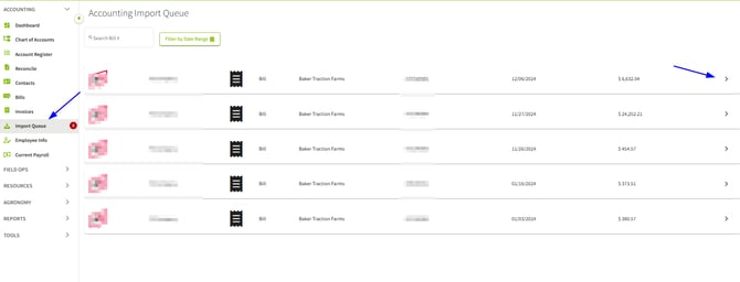 1. Navigate to the Import Queue found underneath Accounting and click on the arrow found to the right of the desired Bill.