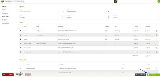 2. Edit the Bill Information as needed and click Save & Import.