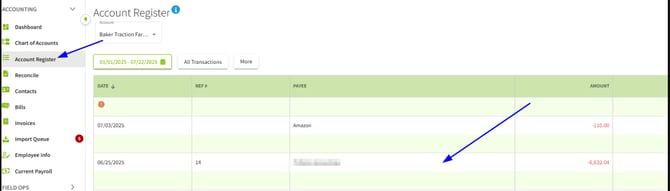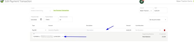 3. Now that you have imported the Bill that came in from the Billing Partner, we will walk through editing the payment you made on the manually entered version of the bill. Navigate to the Account Register where you made the manually entered bill payment and open the transaction by clicking on it.
