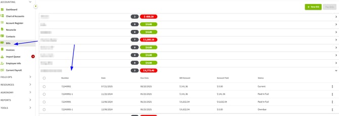 1. Navigate to the Bills Section, find the desired contact and expand the list to view the Bills.