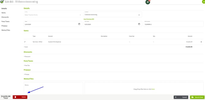 3. Locate the Delete button found at the bottom left hand side and click Delete. You will now only have one entry of this Bill from the import queue.