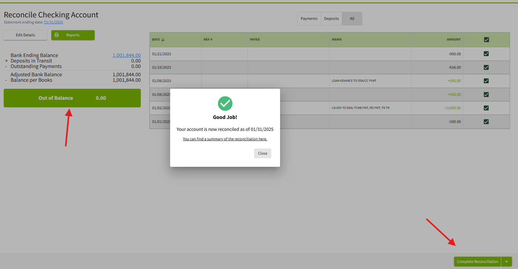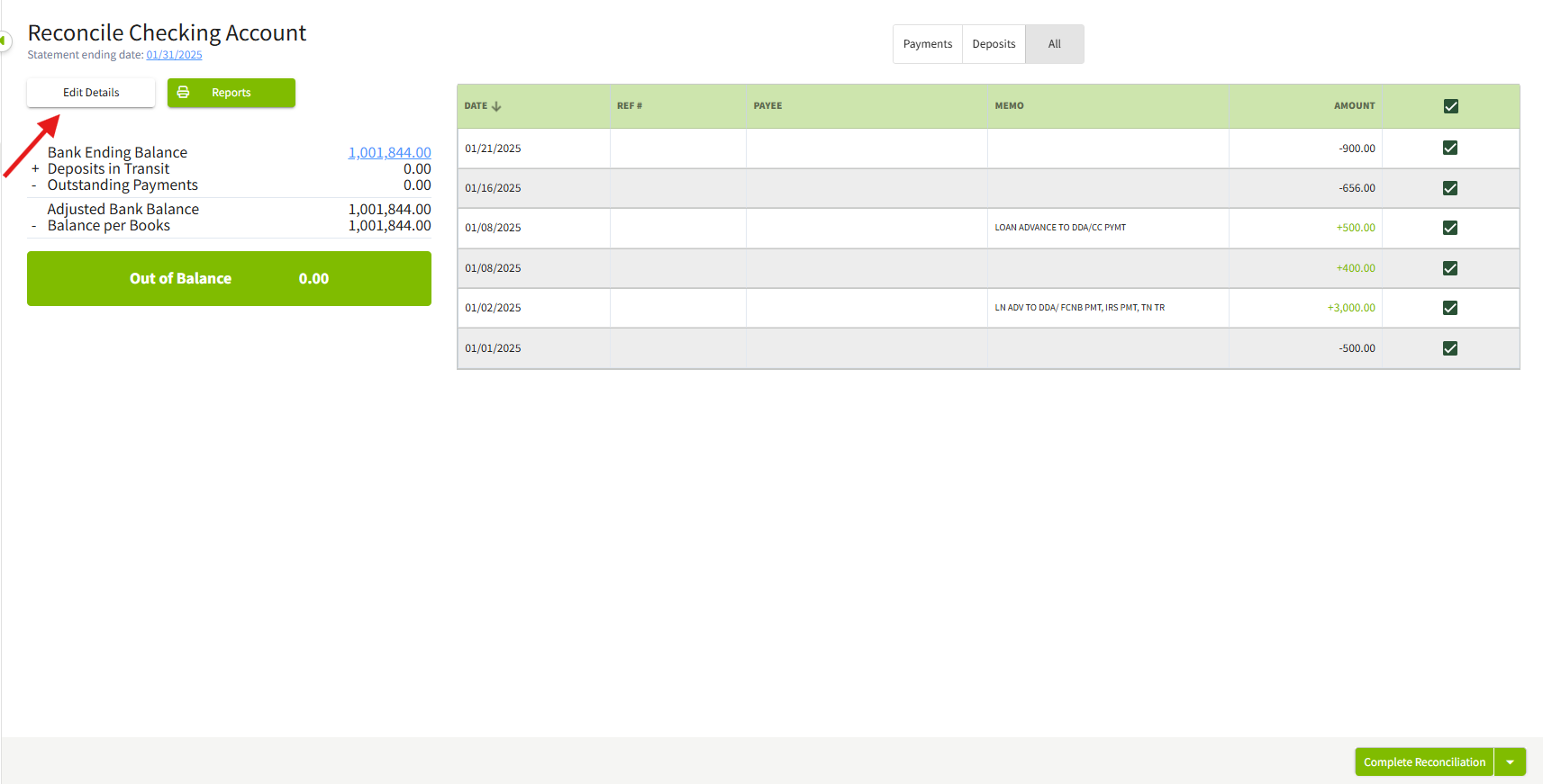4. Once all of the transactions are checked, and the Out Of Balance button to the left says 0.00, you can click the Complete Reconciliation button at the bottom right.