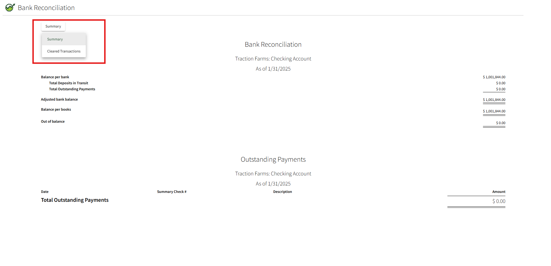 There is also an option to View Reports to see any outstanding payments or deposits in a Summary, as well as Cleared Transactions.