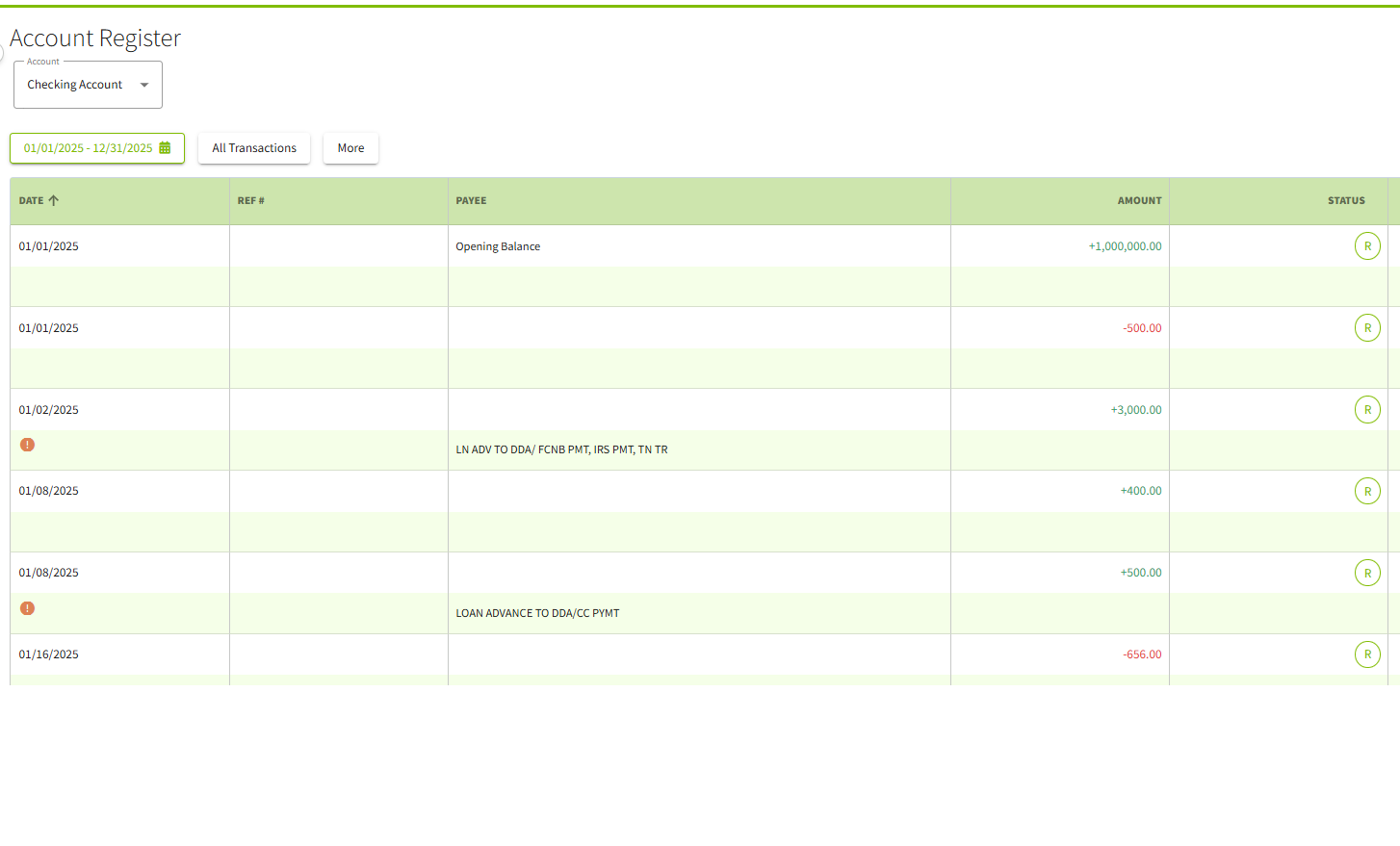 5. Click on the Account Register to view the transactions. The Status of all of the transactions has been updated to R.