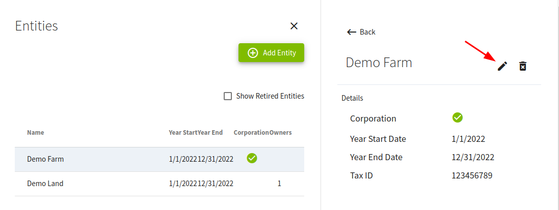 2. Click on the entity that is associated with the account you are trying to reconcile. A new panel will open. Click on the pencil icon to enter the edit mode.