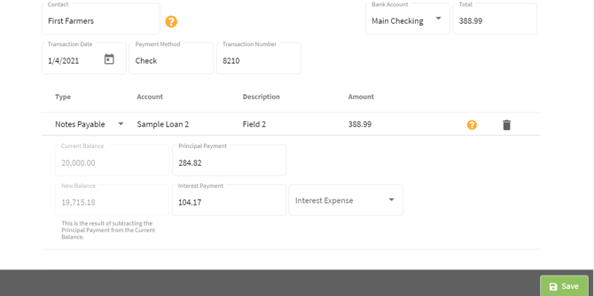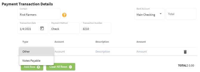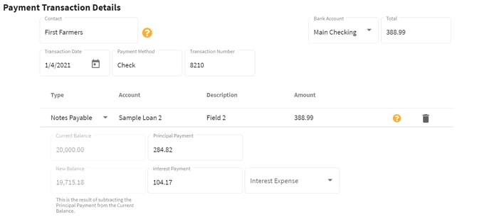 3. Click on the Account column and select which Notes Payable account you want to pay. The Total, Principal Payment and Interest Payment amounts will automatically populate. Fill-in the Description line for the transaction.
