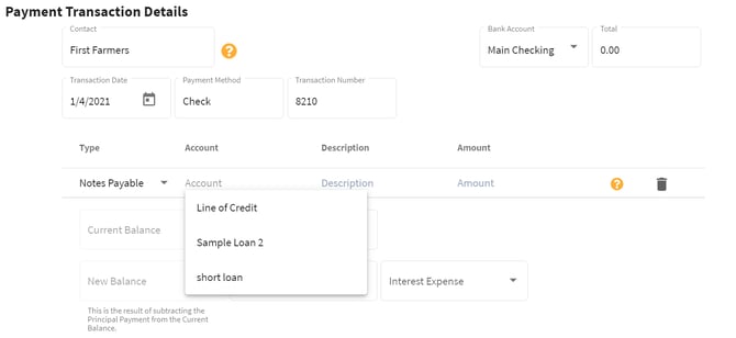 2. Fill-in the details for the transaction (the amount can be entered or wait until it is calculated in the next step). Select Notes Payable in the Type column. When this is selected the Current Balance, New Balance, Principal Payment, and Interest Payment boxes will appear.