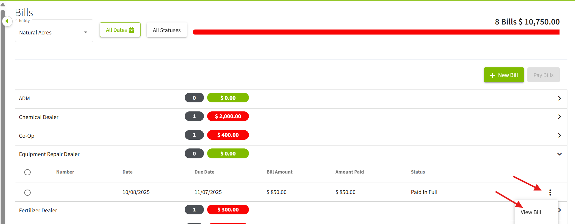 5. You will return to the Bill screen, showing only your vendors where there is an open invoice. To see all invoices, regardless of status, you can use the filter button and choose All Statuses. The status will be listed for each row's invoice. You can also filter by a date range as well.