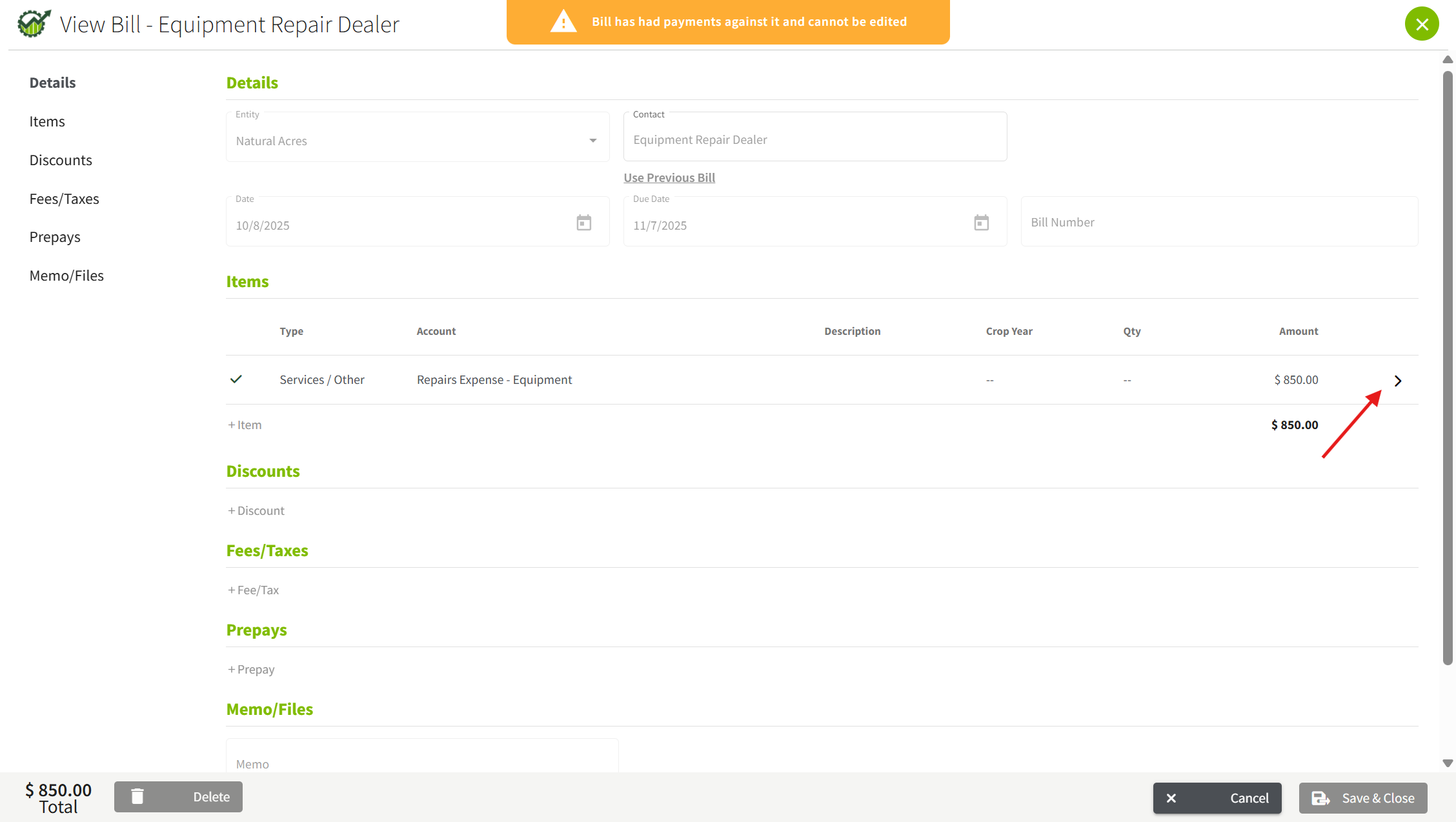 4. Review your entry. If everything looks good, click the Save & Close button to create the Bill.