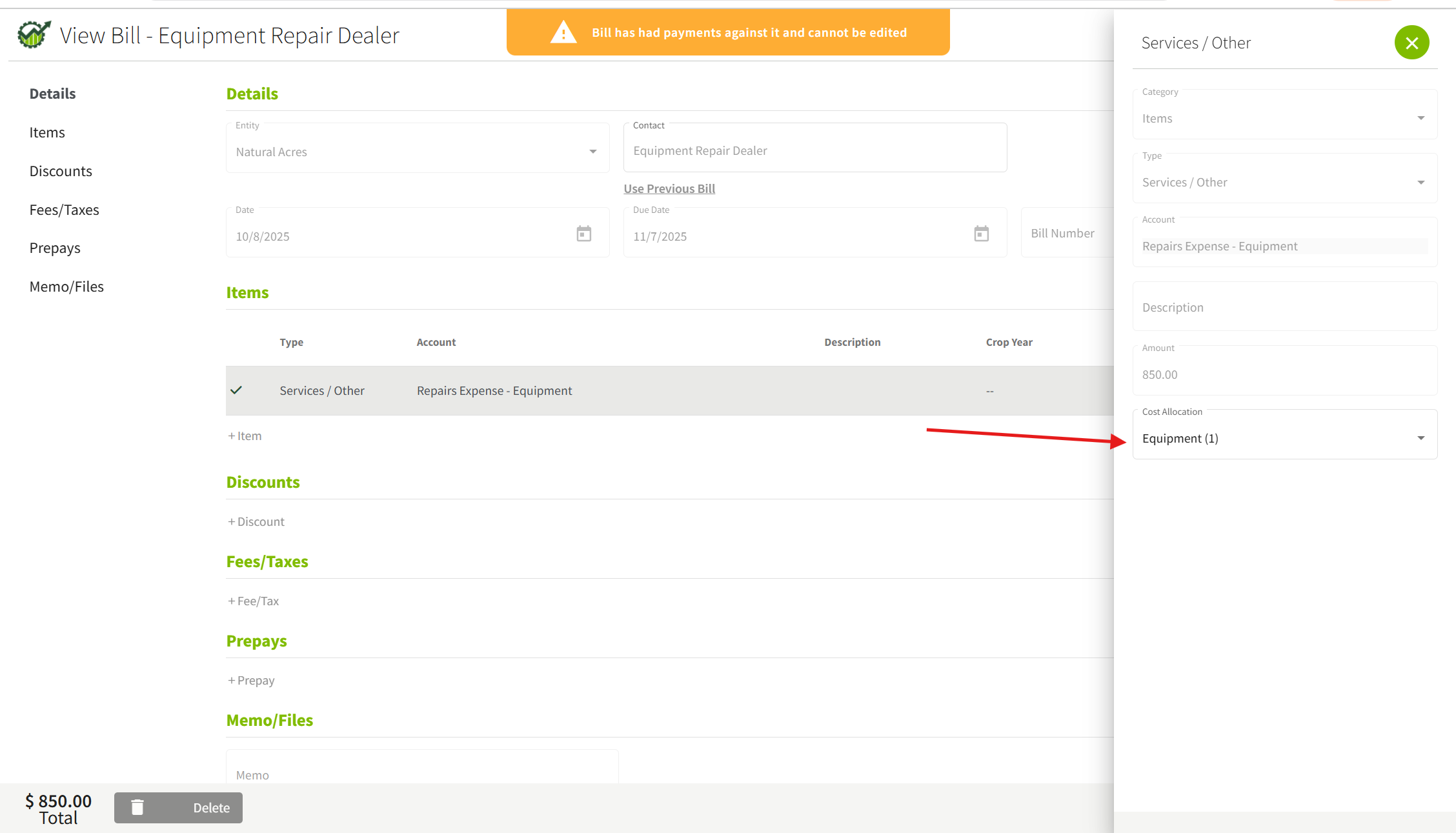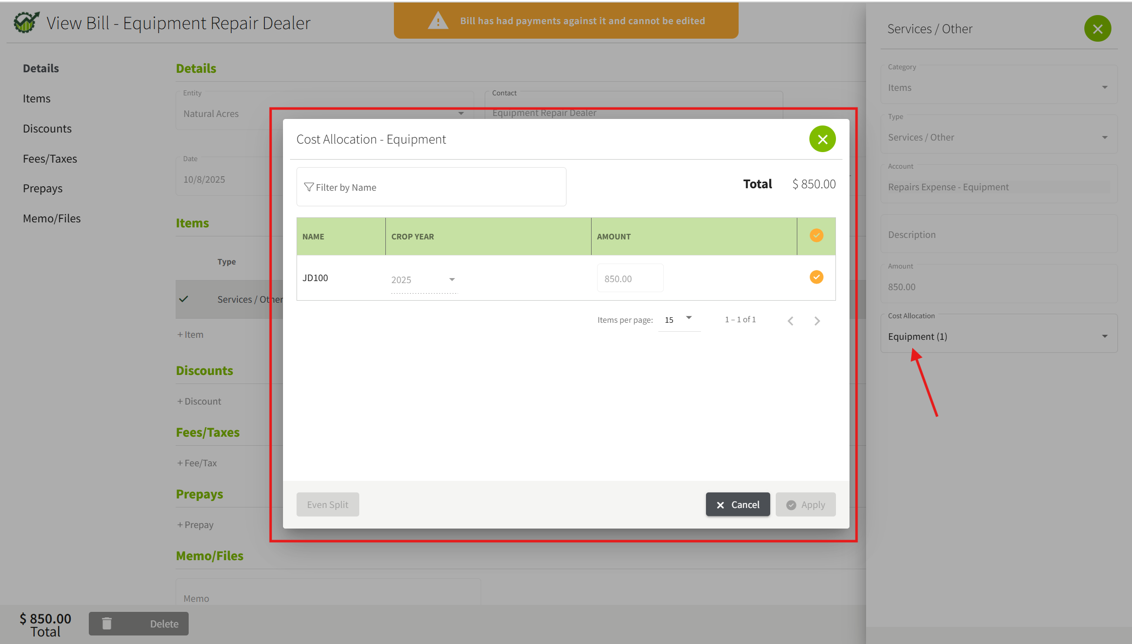 You also have the ability to apply these costs directly to an individual or group of Fields or Equipment. Select the appropriate one from the Cost Allocation dropdown and distribute the cost as needed.